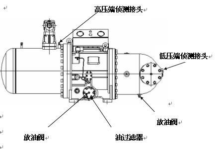 2.壓縮機(jī)的潤滑油,從油過濾器上的放油閥處放出,潤滑油接近放完時(shí),從壓縮機(jī)的高壓端偵測接頭處,注入一定壓力的氮?dú)猓?/span>1.0MPa左右),用壓力加快潤滑油排出,停止注入氮?dú)猓P(guān)閉放油閥。然后將壓縮機(jī)的油過濾器拆卸下來,將油槽里的潤滑油全部放出來,再將油過濾器清洗后裝上緊固。如圖所示: